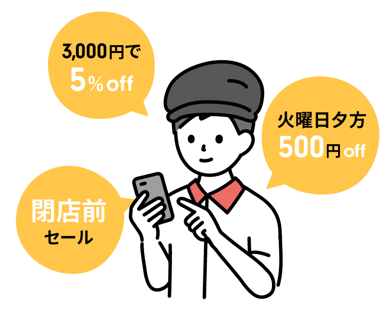 「今日だけ」「●時から」「●日から」など、特売クーポンを発信し、商品や食品ロス削減に。